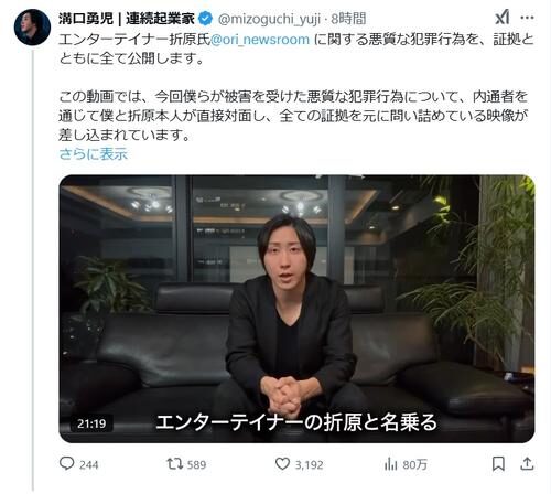 YouTubeから注目を集め、社会問題に切り込むスタンスで脚光を浴びたはずが、いつの間にか複数の刑事事件の“被告人候補”に転じてしまった折原。