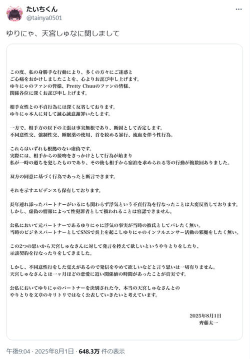 天宮しゅなさんの告発に対し、自らXで長文の声明を発表。
