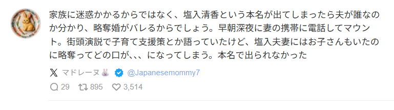 「不倫略奪婚」「本名非公開」「隠された家庭」…こうしたキーワードがハッシュタグとして拡散され、政治の話というより芸能ゴシップに近い文脈で語られた側面もあります。